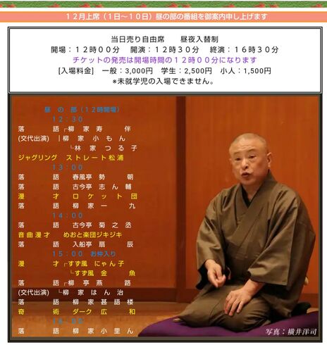 【11/21追記】来月黒門亭2部出演の予定を追加しました。12/21(土)14:30開演です! 【11/12追記】上席の出番が決まりました。2(月)・5(木)・8(日)・10(火)の4日間です!! 【11/6追記】12月上席に上野鈴本演芸場昼席に入れていただきました。師匠小里んの芝…