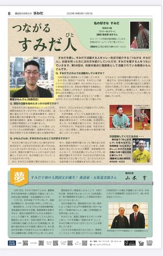 すみだ人掲載 令和5年12月1日付『すみだ区報』内 「すみだ人」に、掲載していただきました! 寄席 ・上野鈴本演芸場 上席夜の部 主任:柳家さん花 4日(月)・8日(金)いずれも17:00 http://www.rakugo.or.jp/2023-12kami-yoru.html ・新宿末廣亭 下席昼の部 主…